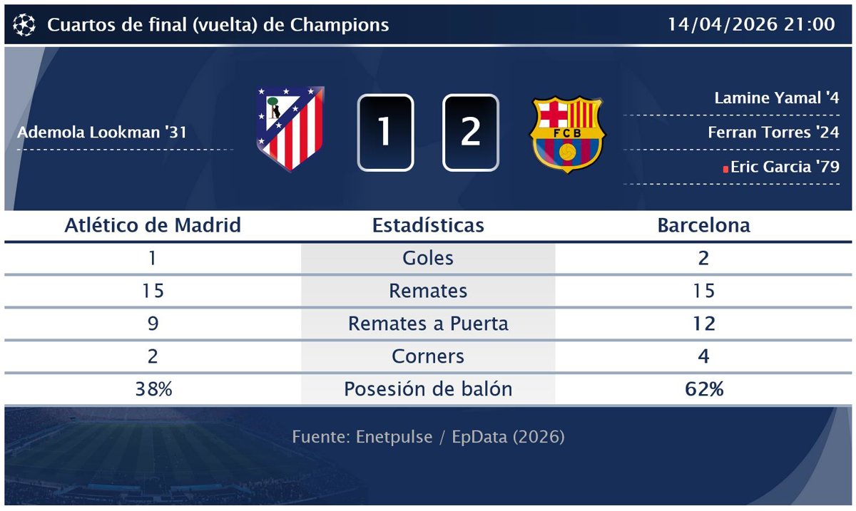 El Atlético de Madrid ha perdido este martes por 1-2 ante el Barcelona en el partido de vuelta de los cuartos de final de la Champions, pero se clasifica a la siguiente ronda con un total de goles de 3 a 2 entre el partido de ida y de vuelta. En el Riyadh Air Metropolitano, los visitantes se adelantaron rápidamente en el marcador con un gol de Lamine Yamal en el minuto 4, asistido por Ferran Torres. El propio Torres amplió la ventaja en el minuto 24 tras un pase de Dani Olmo. Sin embargo, el Atlético recortó distancias con un gol de Ademola Lookman en el minuto 31, asistido por Marcos Llorente. El Barcelona, que dominó la posesión con un 62%, vio cómo se le anulaba un gol a Ferran Torres en el minuto 55 por fuera de juego tras revisión del VAR. Además, el equipo visitante se quedó con diez jugadores tras la expulsión de Eric García en el minuto 79, pero el marcador no se movió más. Ferran Torres fue el jugador más participativo en el ataque del Barcelona, contribuyendo con un gol y una asistencia.