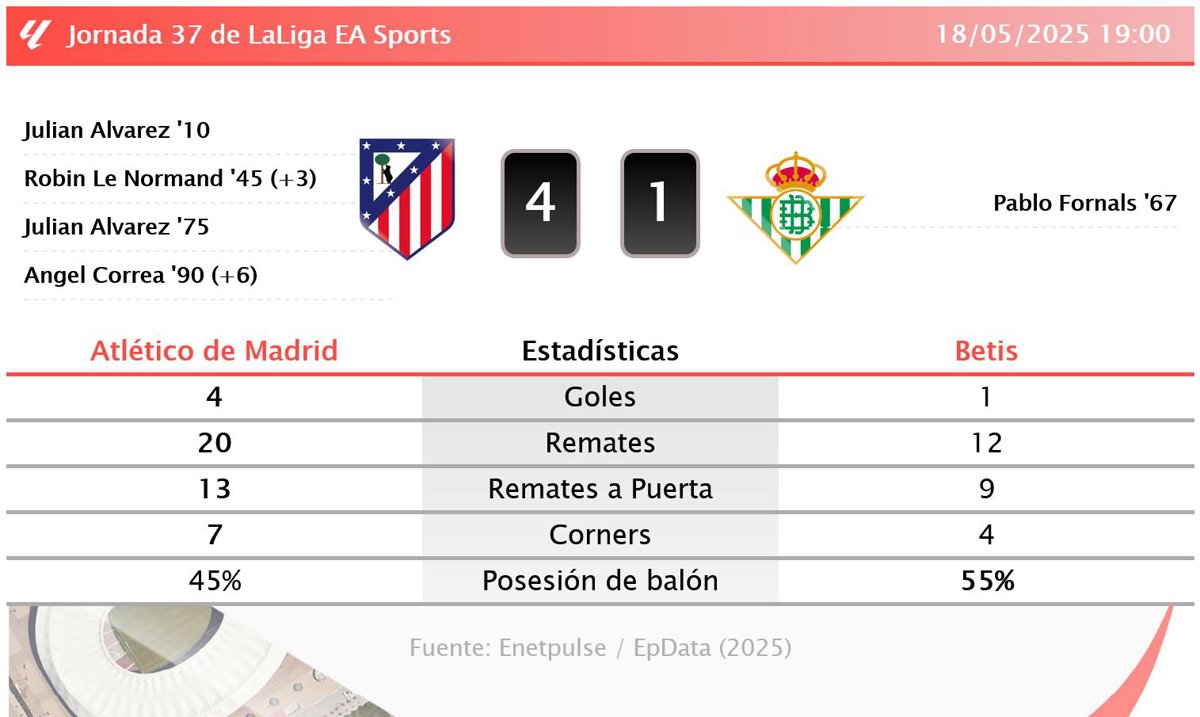 Atlético de Madrid 4 - 1 Betis: resumen y estadísticas del partido de la jornada 37 de LaLiga EA Sports - EUROPA PRESS (2025)