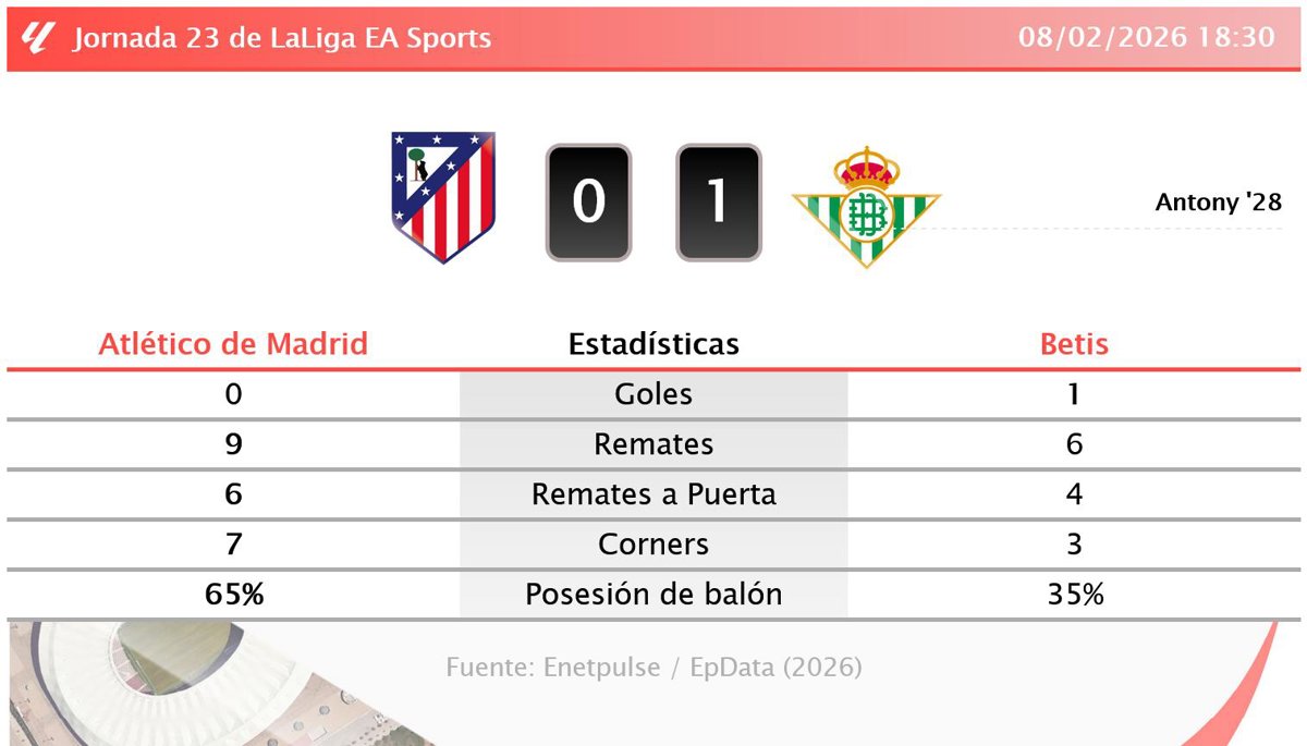 Atlético de Madrid 0 - 1 Betis: resumen y estadísticas del partido de la jornada 23 de LaLiga EA Sports - EUROPA PRESS (2026)