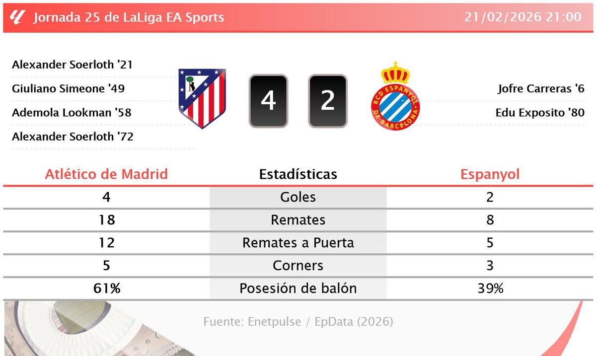 Atlético de Madrid 4 - 2 Espanyol: resumen y estadísticas del partido de la jornada 25 de LaLiga EA Sports - EUROPA PRESS (2026)