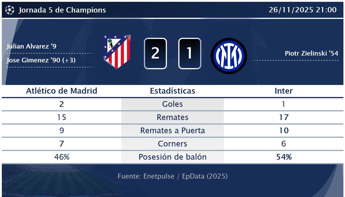 | 26/11/2025 | Champions | Atlético | 2-1 | Inter |