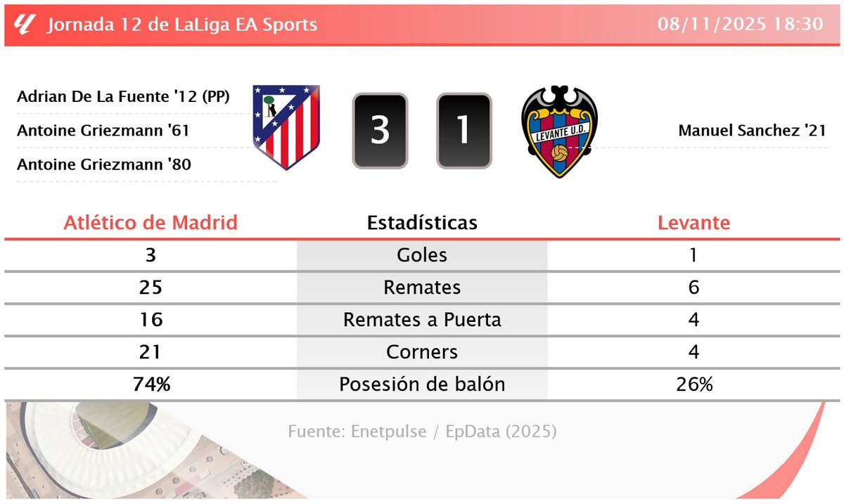 --RESULTADO: ATLÉTICO DE MADRID 3 - LEVANTE 1 (1-1, al descanso).