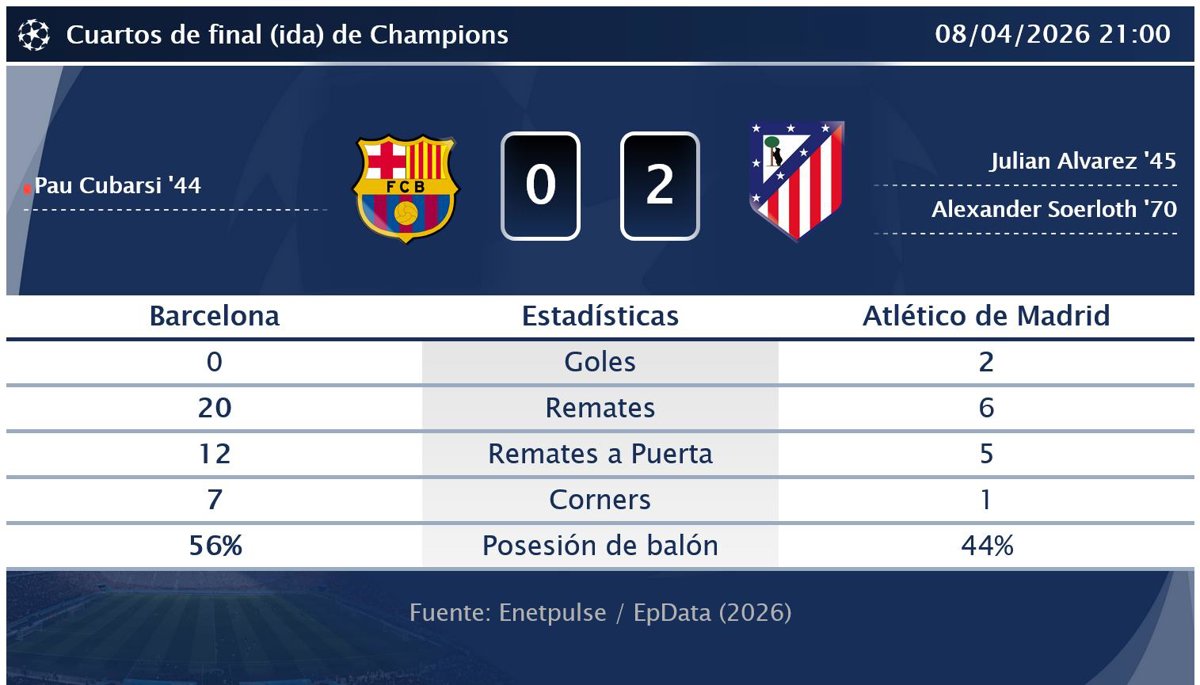 Barcelona 0 - 2 Atlético de Madrid: resumen y estadísticas del partido de la jornada 3 de Champions - EUROPA PRESS (2026)
