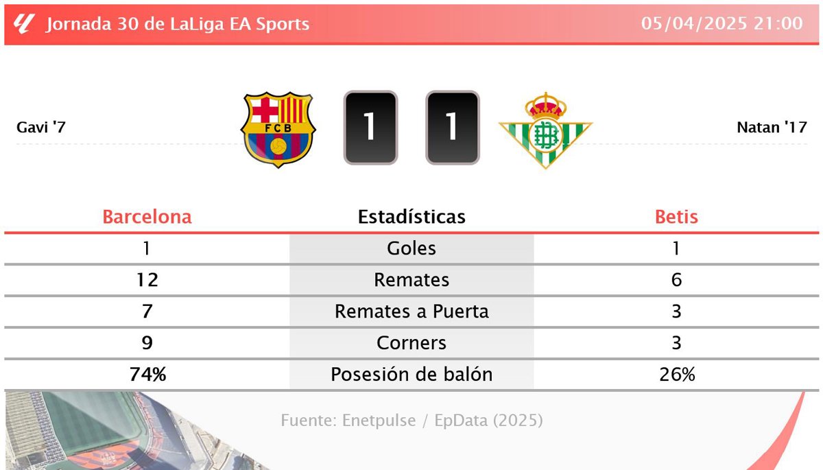 Barcelona 1 - 1 Betis: resumen y estadísticas del partido de la jornada 30 de LaLiga EA Sports - ENETPULSE / EPDATA (2025)