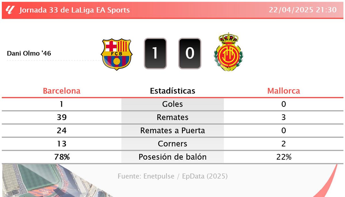 El Barcelona se impuso por la mínima ante el Mallorca en un partido marcado por su absoluta dominación, con un 78% de posesión y 39 remates por solo 3 de los visitantes. Dani Olmo, autor del único gol en el minuto 46 tras asistencia de Eric Garcia, fue el jugador más participativo en ataque, destacando en un encuentro donde los azulgranas ejercieron un control total del juego en el Estadio Olimpico Lluis Companys ante un Mallorca que apenas inquietó la portería local.