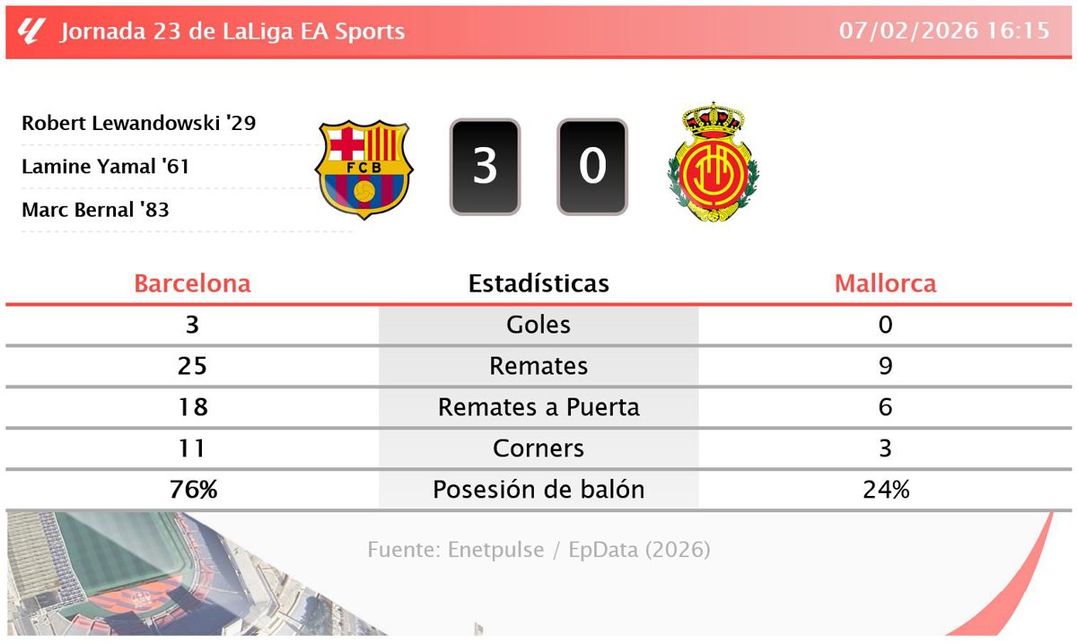 Barcelona 3 - 0 Mallorca: resumen y estadísticas del partido de la jornada 23 de LaLiga EA Sports - EUROPA PRESS (2026)
