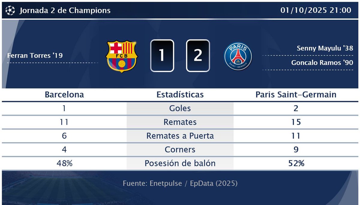 El Barcelona cayó derrotado este miércoles por 1-2 ante el Paris Saint-Germain en un partido de la segunda jornada de Champions, donde los locales adelantaron inicialmente el marcador con un gol de Ferran Torres en el minuto 19, pero los parisinos remontaron con tantos de Senny Mayulu en el minuto 38 y de Goncalo Ramos en el último minuto del encuentro. El conjunto blaugrana tuvo un mayor protagonismo en el juego, con más posesión (48%) y más remates (11), pero no pudo materializar su dominio ante un efectivo Paris Saint-Germain que fue más certero de cara a portería.
