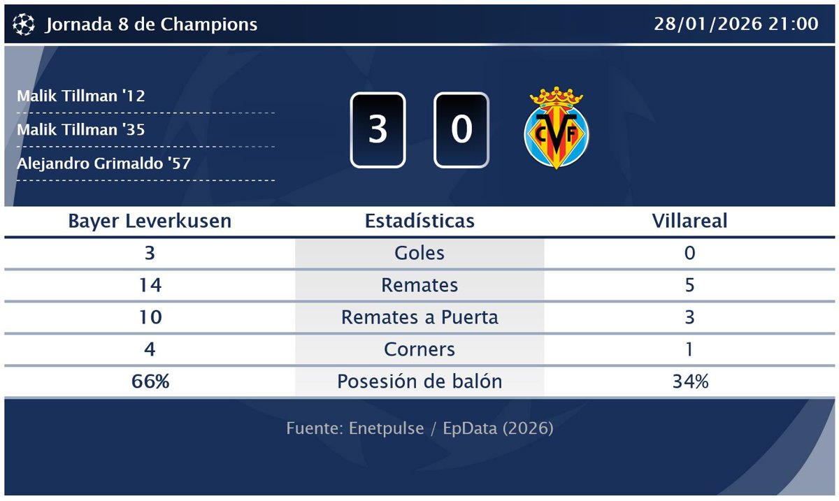 Bayer Leverkusen 3 - 0 Villareal: resumen y estadísticas del partido de la jornada 8 de Champions - EUROPA PRESS (2026)