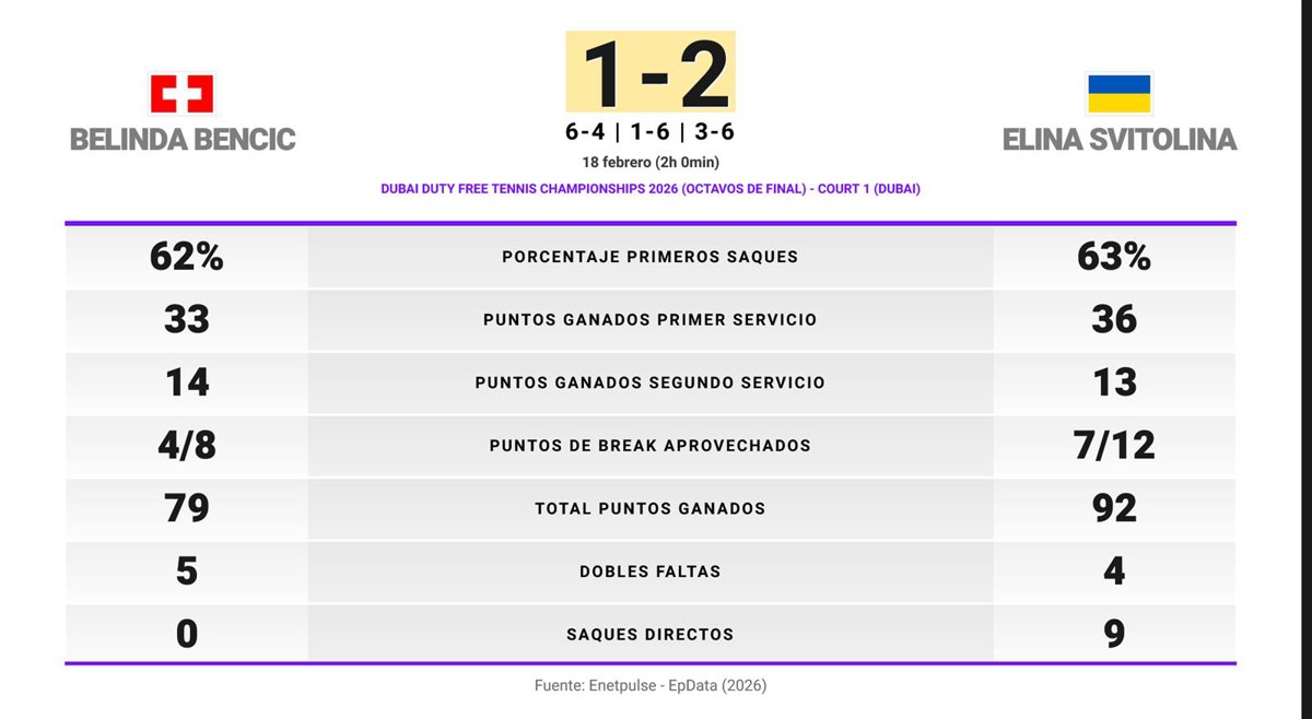 Belinda Bencic 1 - 2 Elina Svitolina: resumen y estadísticas del partido de Dubai Duty Free Tennis Championships (WTA) - EUROPA PRESS (2026)