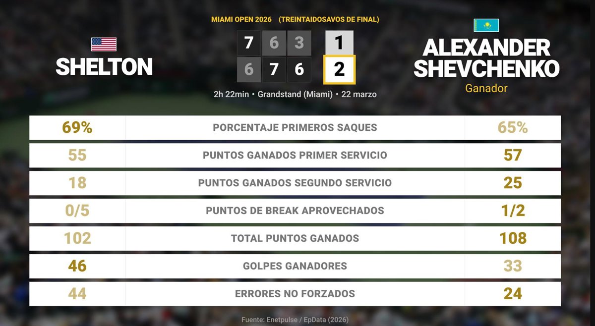 Ben Shelton 1 - 2 Alexander Shevchenko: resumen y estadísticas del partido de Miami Open (ATP) - EUROPA PRESS (2026)