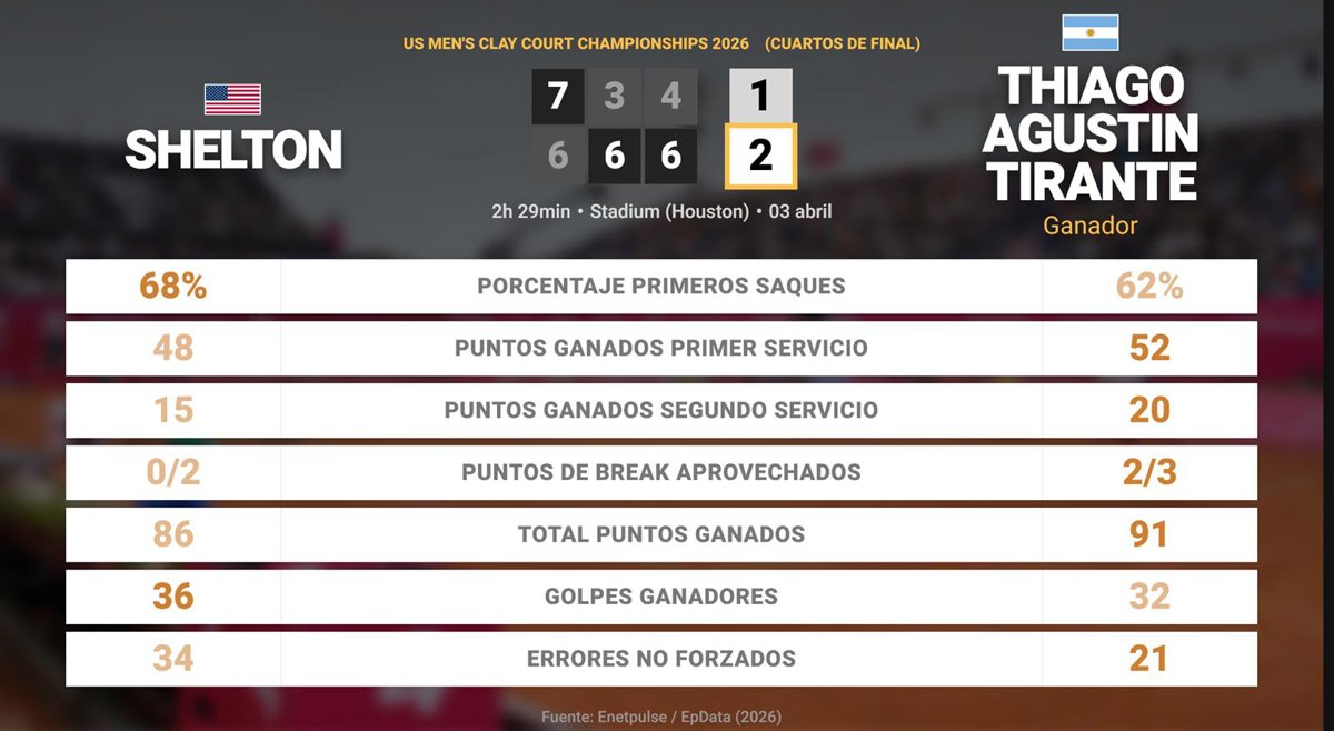 Ben Shelton 1 - 2 Thiago Agustin Tirante: resumen y estadísticas del partido de US Men's Clay Court Championships (ATP) - EUROPA PRESS (2026)