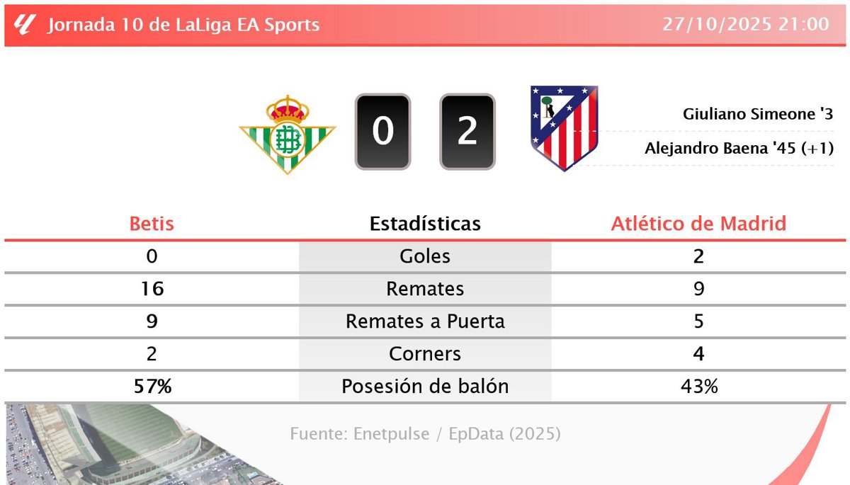 Betis 0 - 2 Atlético de Madrid: resumen y estadísticas del partido de la jornada 10 de LaLiga EA Sports - EUROPA PRESS (2025)