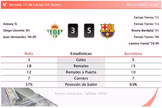 Betis 3 - 5 Barcelona: resumen y estadísticas del partido de la jornada 15 de LaLiga EA Sports - EUROPA PRESS (2025)