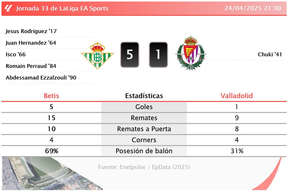 Betis 5 - 1 Valladolid: resumen y estadísticas del partido de la jornada 33 de LaLiga EA Sports - EUROPA PRESS (2025)