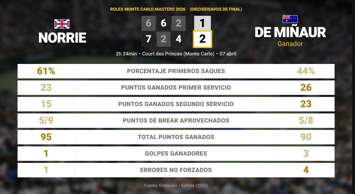 Cameron Norrie 1 - 2 Alex de Minaur: resumen y estadísticas del partido de Rolex Monte Carlo Masters (ATP) - EUROPA PRESS (2026)