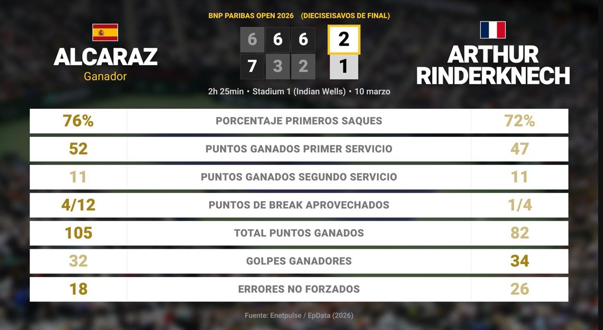 Carlos Alcaraz 2 - 1 Arthur Rinderknech: resumen y estadísticas del partido de BNP Paribas Open (ATP) - EUROPA PRESS (2026)
