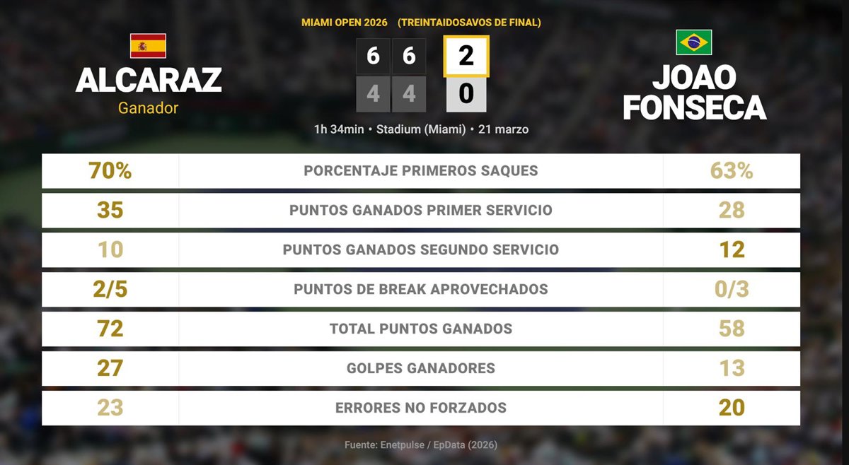 Carlos Alcaraz 2 - 0 Joao Fonseca: resumen y estadísticas del partido de Miami Open (ATP) - EUROPA PRESS (2026)
