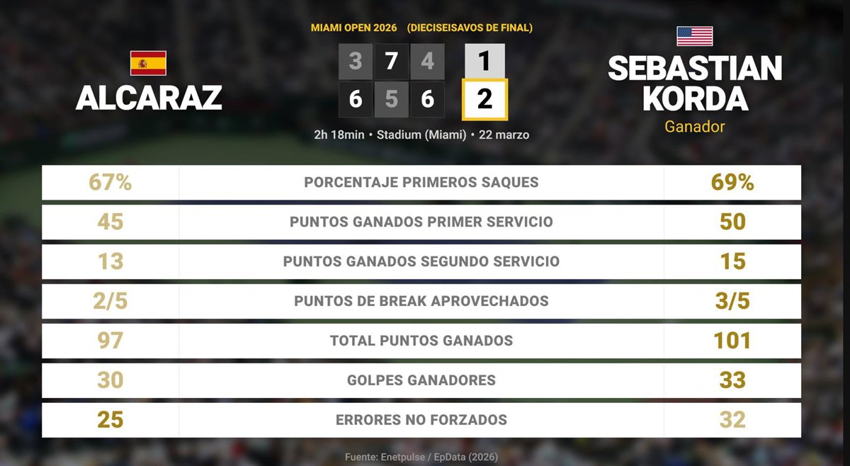 El tenista estadounidense Sebastian Korda ha avanzado a los octavos de final del torneo Miami Open, de categoría ATP Tour Masters 1000 y que se disputa en pista dura, tras ganar al español Carlos Alcaraz (6-3, 7-5, 6-4) en un partido que destacó por la solidez en el servicio de Korda y su habilidad para aprovechar las oportunidades de quiebre.