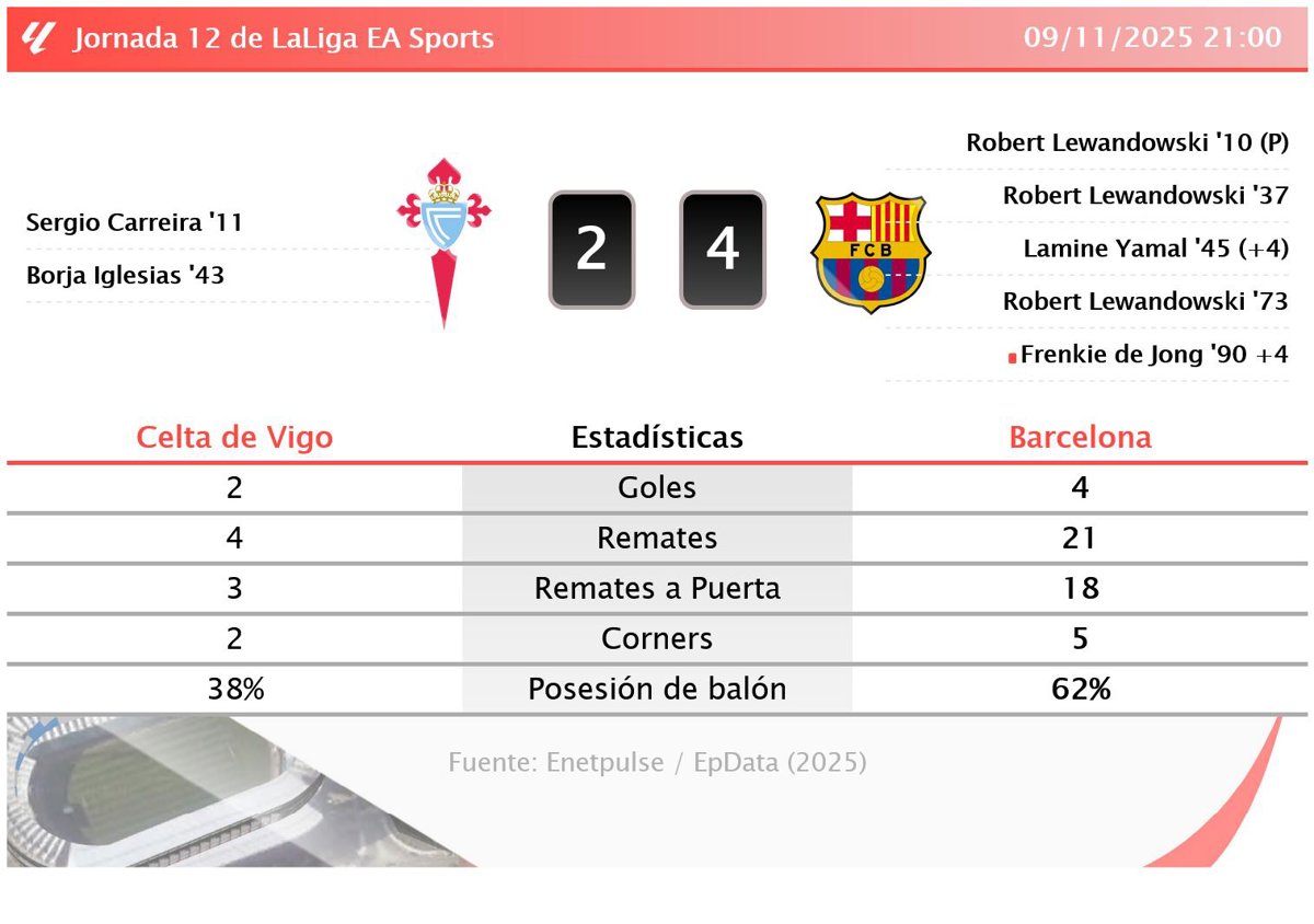 El Barcelona ha ganado este domingo 11/9/2025 9:00:00 PM por 4-2 al Celta de Vigo en el primer partido de la jornada 12 en LaLiga EA Sports. Los goleadores fueron Sergio Carreira '11, Borja Iglesias '43, Robert Lewandowski '10 (P), '37, '73 y Lamine Yamal '45 (+4). Cabe destacar la expulsión de Frenkie de Jong '90 +4 del Barcelona, que pudo ser determinante en el resultado final del partido. El conjunto azulgrana, que ha sido el más participativo en ataque con 21 remates frente a los 4 del Celta, se sitúa segundo en la clasificación con 28 puntos, a 3 del líder Real Madrid, mientras que los gallegos se mantienen en la decimotercera posición con 13 puntos.