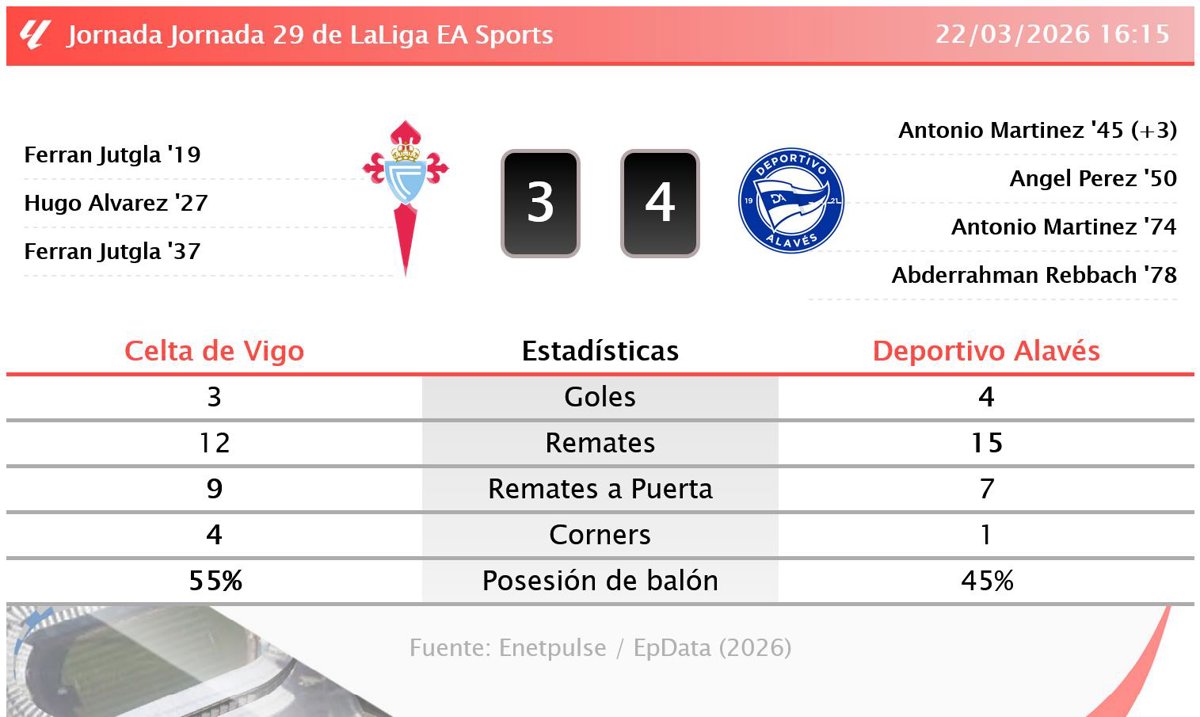 | 22/03/2026 | LaLiga | Celta | 3-4 | Alavés |