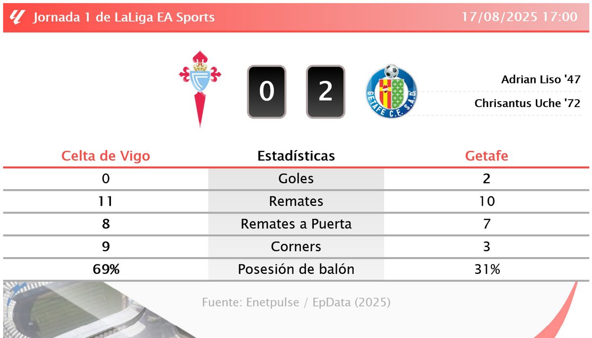 Celta de Vigo 0 - 2 Getafe: resumen y estadísticas del partido de la jornada 1 de LaLiga EA Sports - EUROPA PRESS (2025)