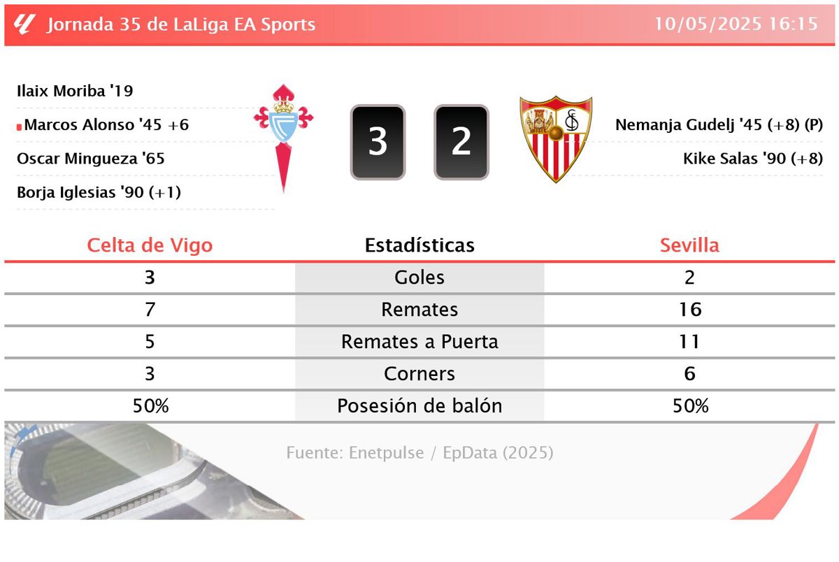 Celta de Vigo 3 - 2 Sevilla: resumen y estadísticas del partido de la jornada 35 de LaLiga EA Sports - EUROPA PRESS (2025)