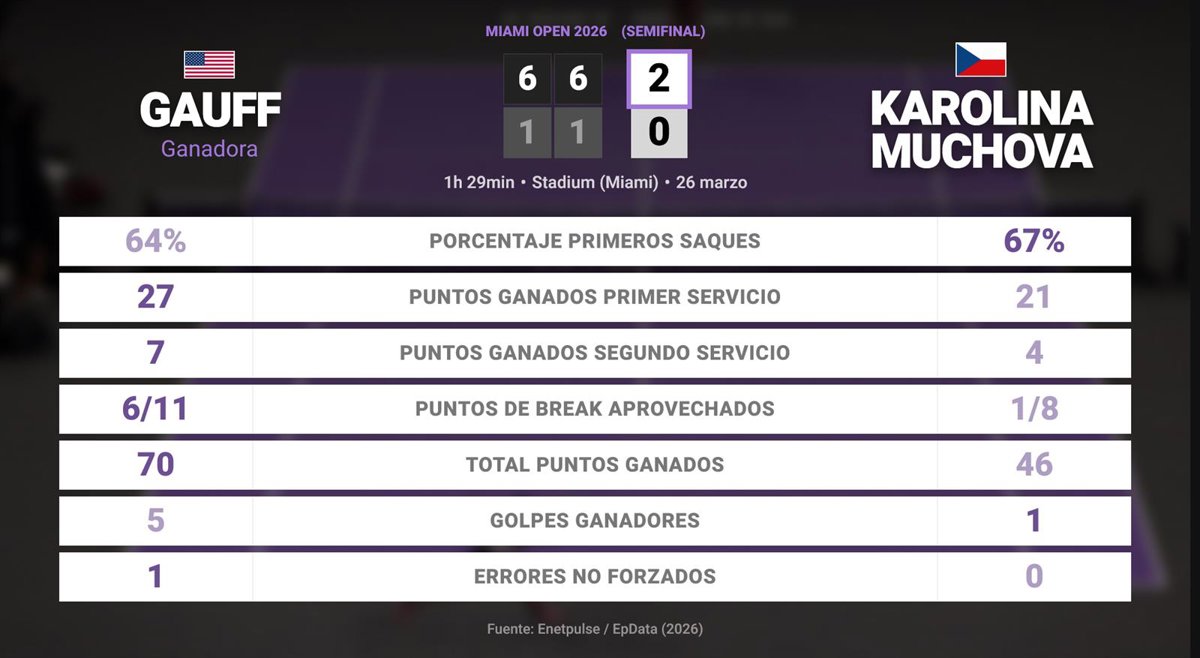 Coco Gauff ha avanzado a la final del torneo Miami Open, de categoría WTA 1000 y que se disputa en pista dura, tras ganar a la checa Karolina Muchova por la vía rápida con un resultado de 6-1, 6-1 en 1 hora y 33 minutos.