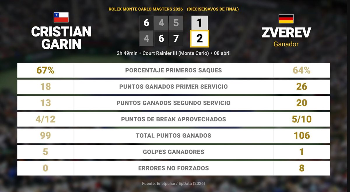 Cristian Garin 1 - 2 Alexander Zverev: resumen y estadísticas del partido de Rolex Monte Carlo Masters (ATP) - EUROPA PRESS (2026)