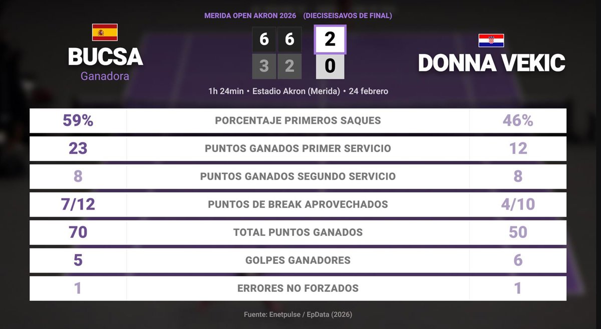 Cristina Bucsa 2 - 0 Donna Vekic: resumen y estadísticas del partido de Merida Open Akron (WTA) - EUROPA PRESS (2026)