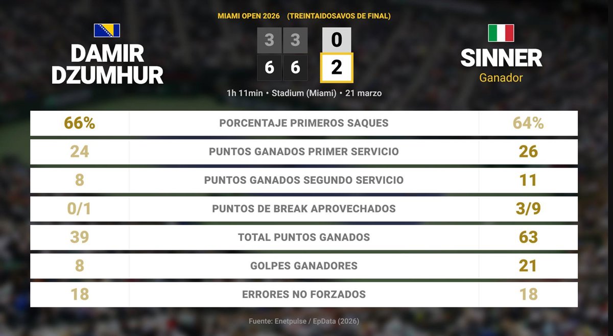Damir Dzumhur 0 - 2 Jannik Sinner: resumen y estadísticas del partido de Miami Open (ATP) - EUROPA PRESS (2026)