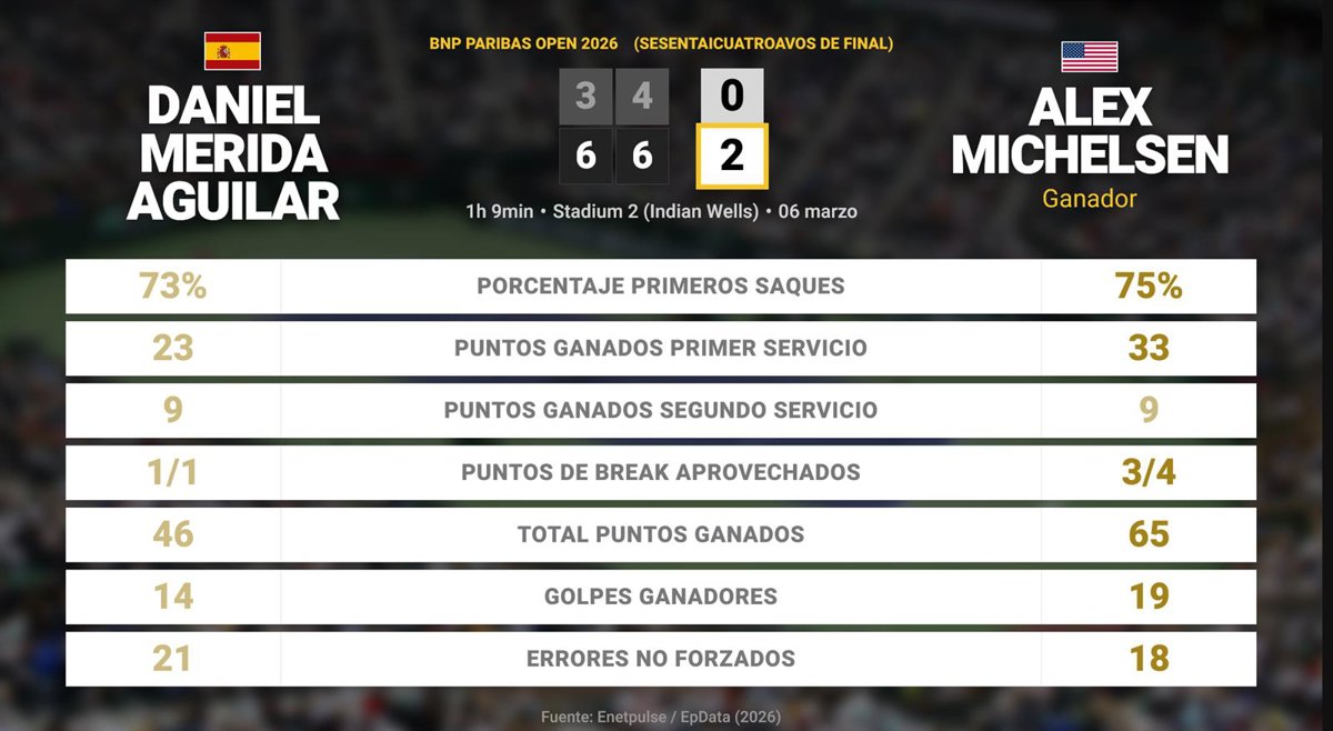 Daniel Merida Aguilar 0 - 2 Alex Michelsen: resumen y estadísticas del partido de BNP Paribas Open (ATP) - EUROPA PRESS (2026)