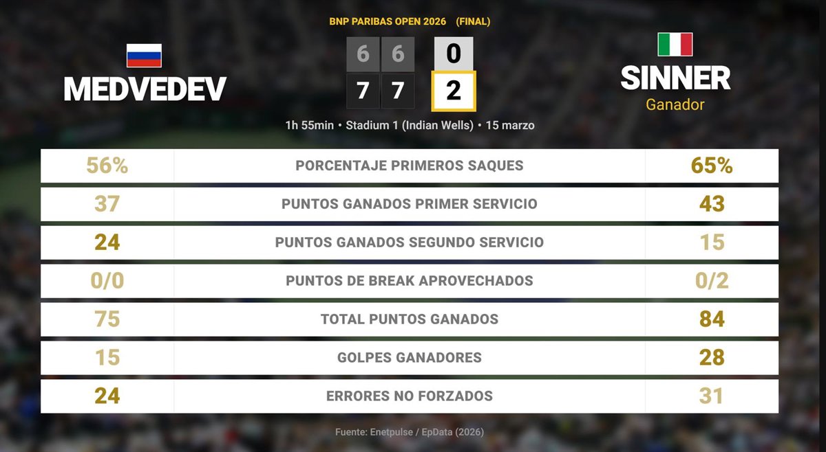 Daniil Medvedev 0 - 2 Jannik Sinner: resumen y estadísticas del partido de BNP Paribas Open (ATP) - EUROPA PRESS (2026)