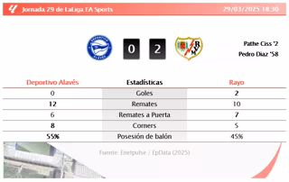 Deportivo Alavés 0 - 2 Rayo: resumen y estadísticas del partido de la jornada 29 de LaLiga EA Sports - ENETPULSE / EPDATA (2025)