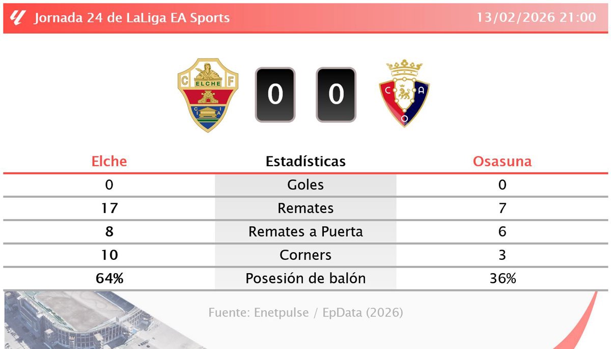 Elche 0 - 0 Osasuna: resumen y estadísticas del partido de la jornada 24 de LaLiga EA Sports - EUROPA PRESS (2026)