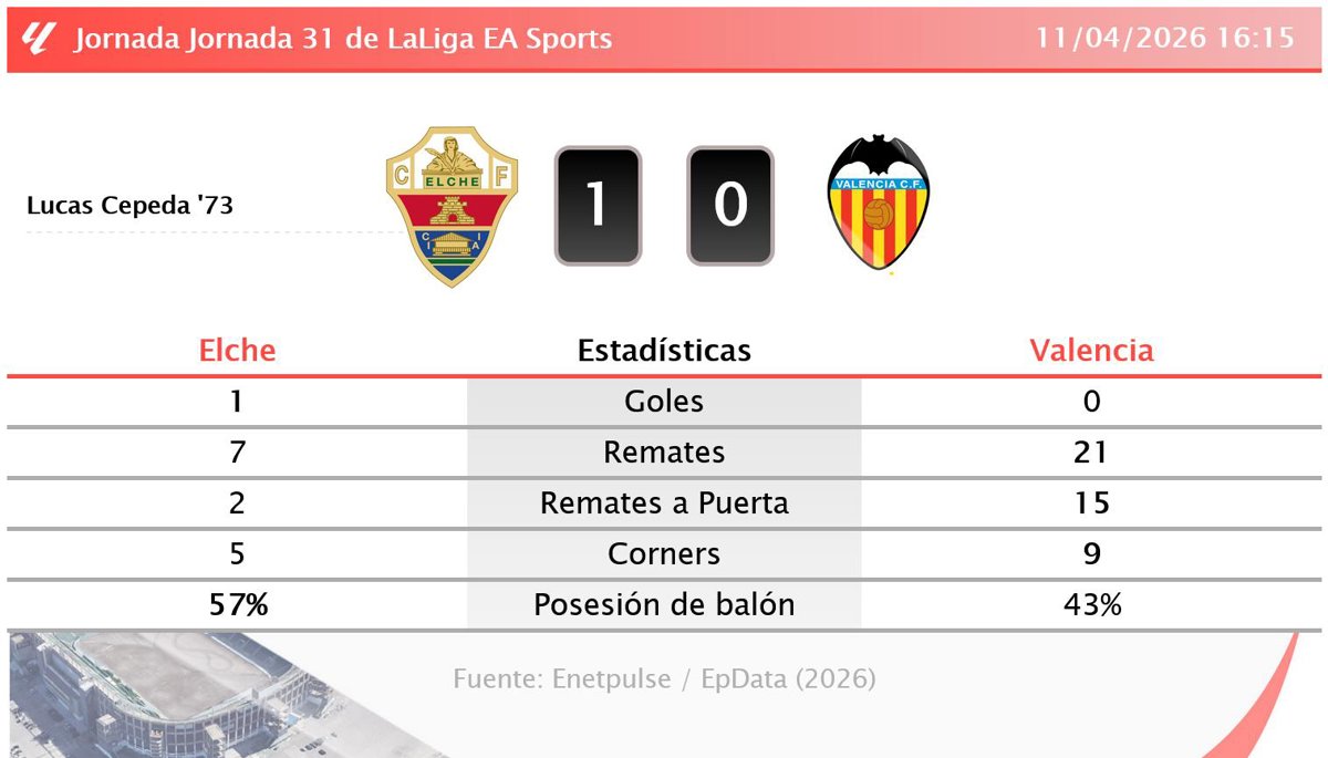Elche 1 - 0 Valencia: resumen y estadísticas del partido de la jornada 31 de LaLiga EA Sports - EUROPA PRESS (2026)