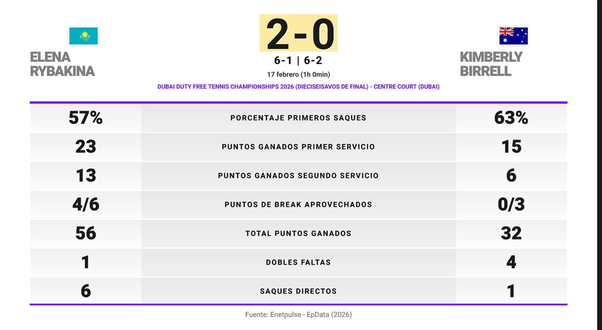 Elena Rybakina 2 - 0 Kimberly Birrell: resumen y estadísticas del partido de Dubai Duty Free Tennis Championships (WTA) - EUROPA PRESS (2026)