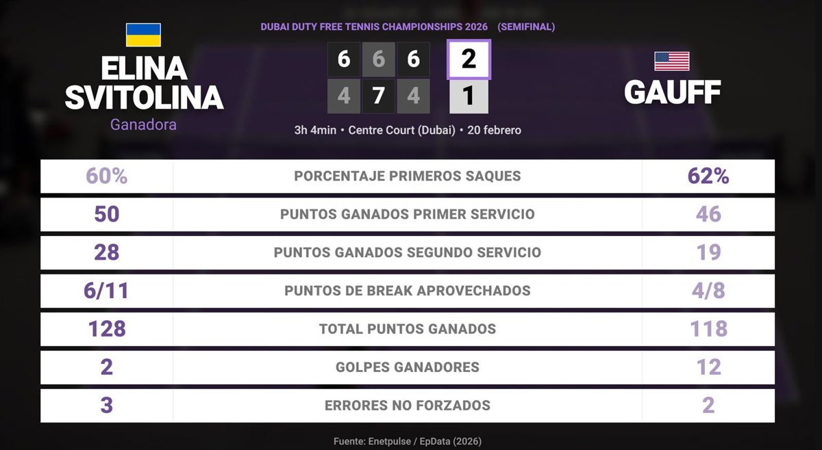 Elina Svitolina 2 - 1 Coco Gauff: resumen y estadísticas del partido de Dubai Duty Free Tennis Championships (WTA) - EUROPA PRESS (2026)