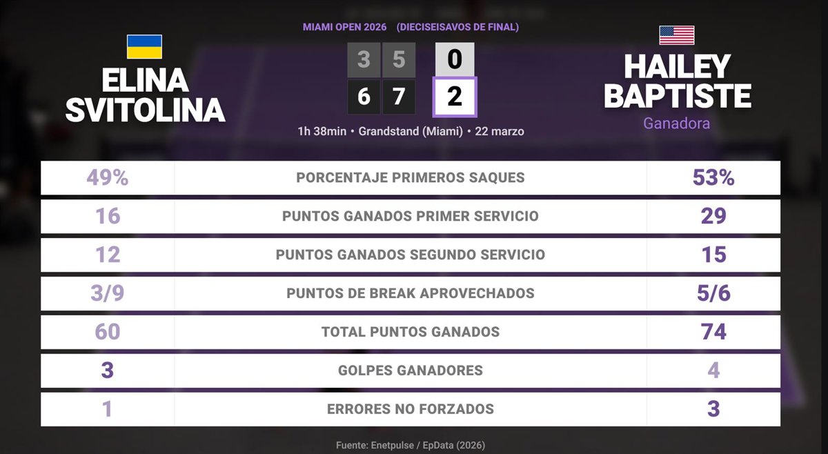 Elina Svitolina 0 - 2 Hailey Baptiste: resumen y estadísticas del partido de Miami Open (WTA) - EUROPA PRESS (2026)