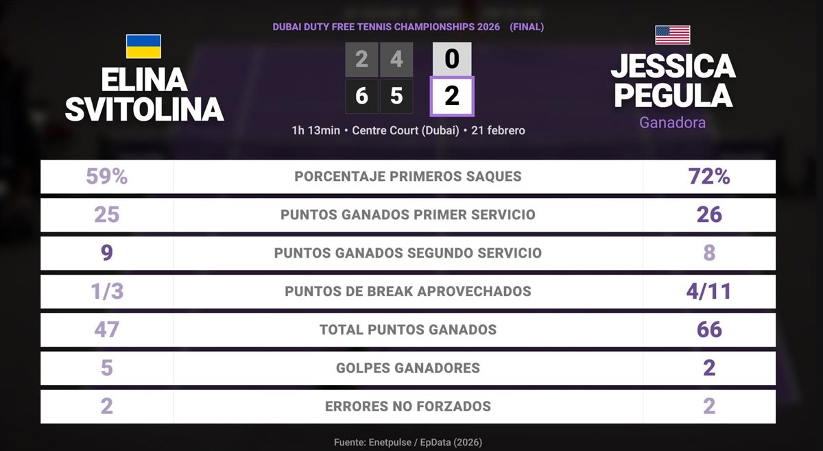 Elina Svitolina 0 - 2 Jessica Pegula: resumen y estadísticas del partido de Dubai Duty Free Tennis Championships (WTA) - EUROPA PRESS (2026)