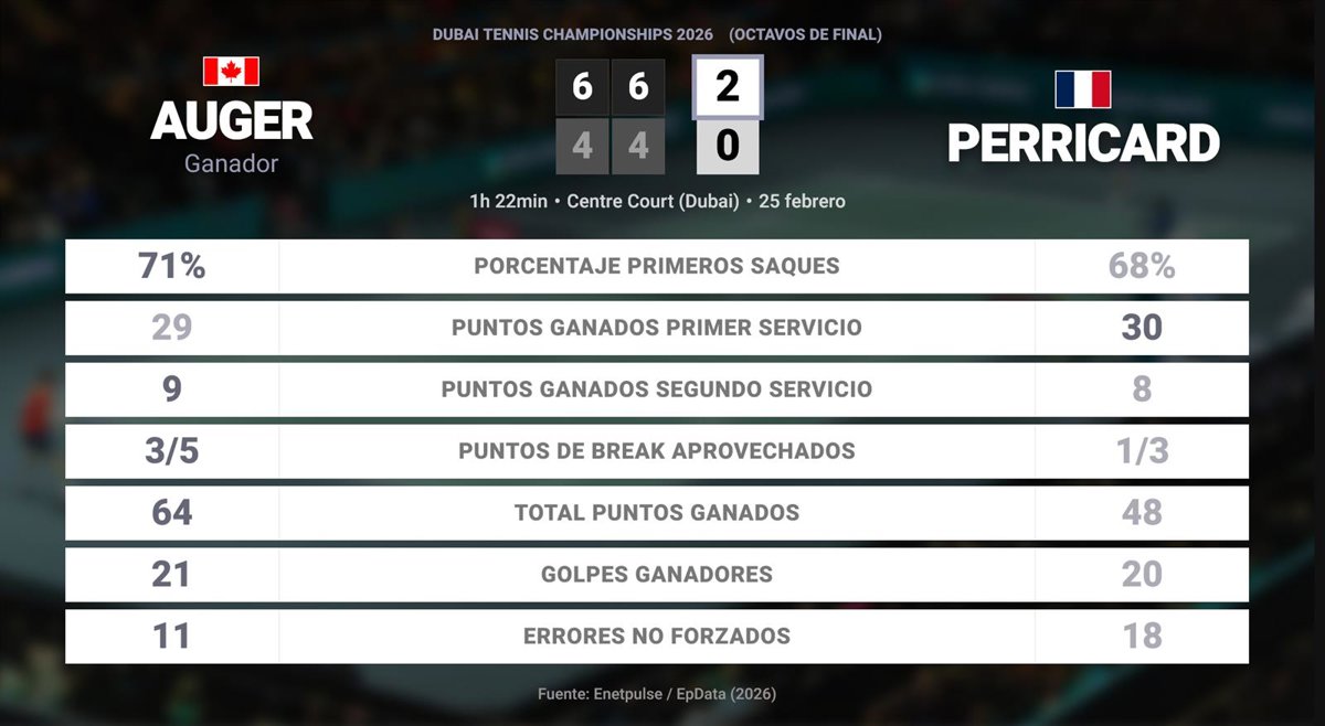 Felix Auger-Aliassime 2 - 0 Giovanni Mpetshi Perricard: resumen y estadísticas del partido de Dubai Tennis Championships (ATP) - EUROPA PRESS (2026)