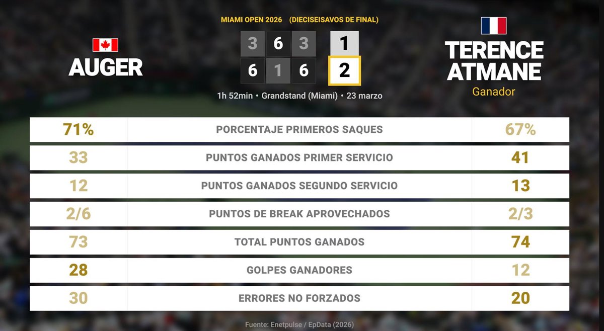 Felix Auger-Aliassime 1 - 2 Terence Atmane: resumen y estadísticas del partido de Miami Open (ATP) - EUROPA PRESS (2026)