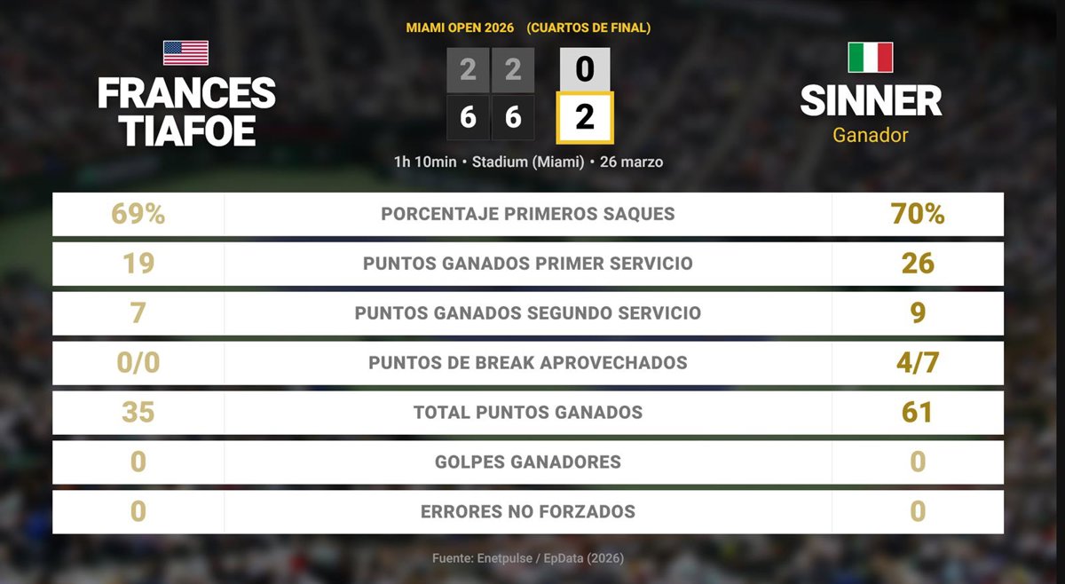 El tenista italiano Jannik Sinner ha avanzado a las semifinales del torneo Miami Open, de categoría ATP Tour Masters 1000 y que se disputa en pista dura, tras ganar al estadounidense Frances Tiafoe por la vía rápida con un resultado de 6-2, 6-2 en 1 hora y 11 minutos.