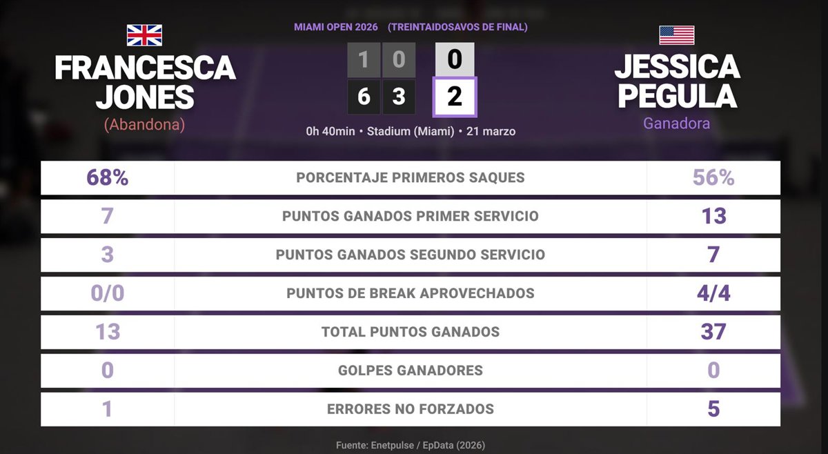 Francesca Jones 0 - 1 Jessica Pegula: resumen y estadísticas del partido de Miami Open (WTA) - EUROPA PRESS (2026)