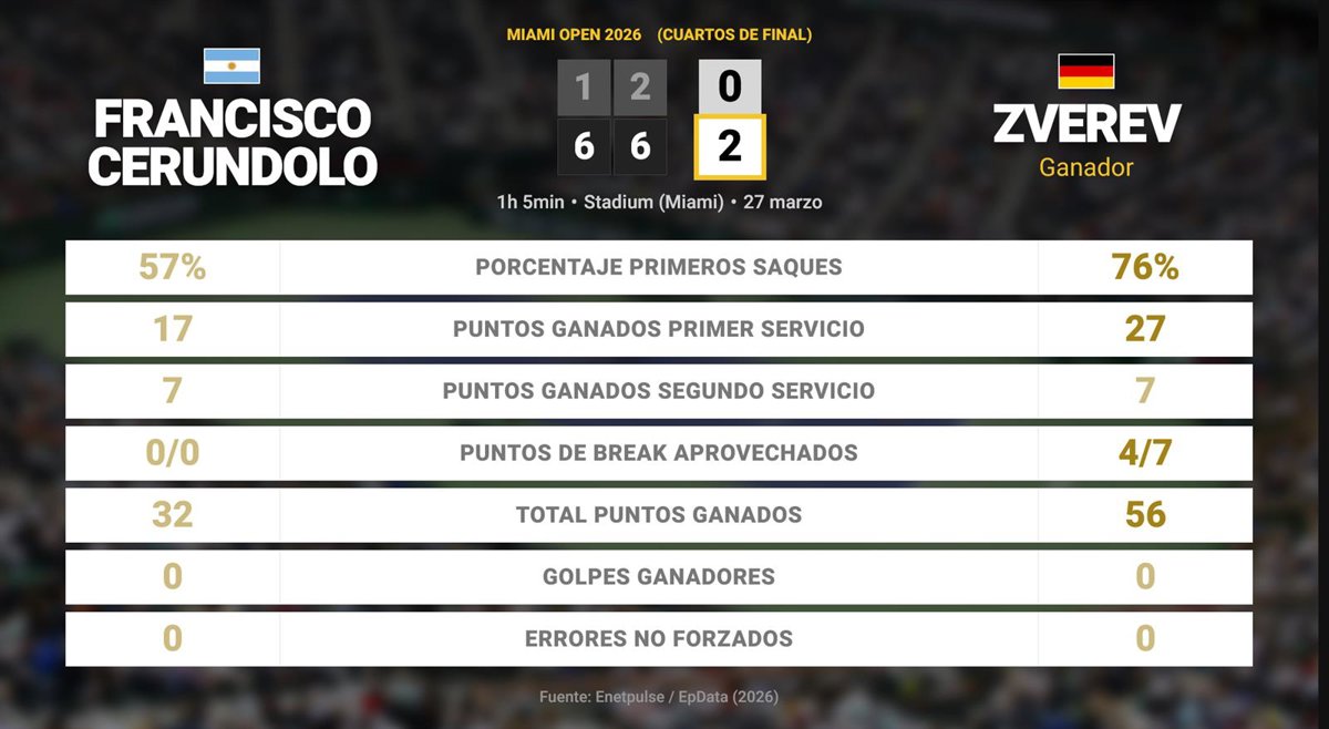 En el primer set, Alexander Zverev logró dos 'breaks' consecutivos en los juegos 2 y 4, manteniendo su servicio en todos sus juegos para cerrar el set 6-1. En el segundo set, Zverev continuó con su dominio, rompiendo el servicio de Cerundolo en los juegos 3 y 5, y manteniendo su propio servicio para llevarse el set 6-2.
