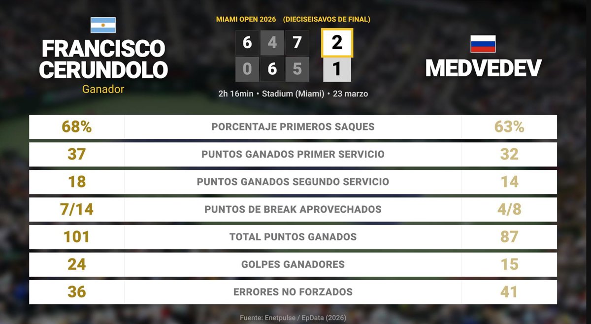 Francisco Cerundolo 2 - 1 Daniil Medvedev: resumen y estadísticas del partido de Miami Open (ATP) - EUROPA PRESS (2026)