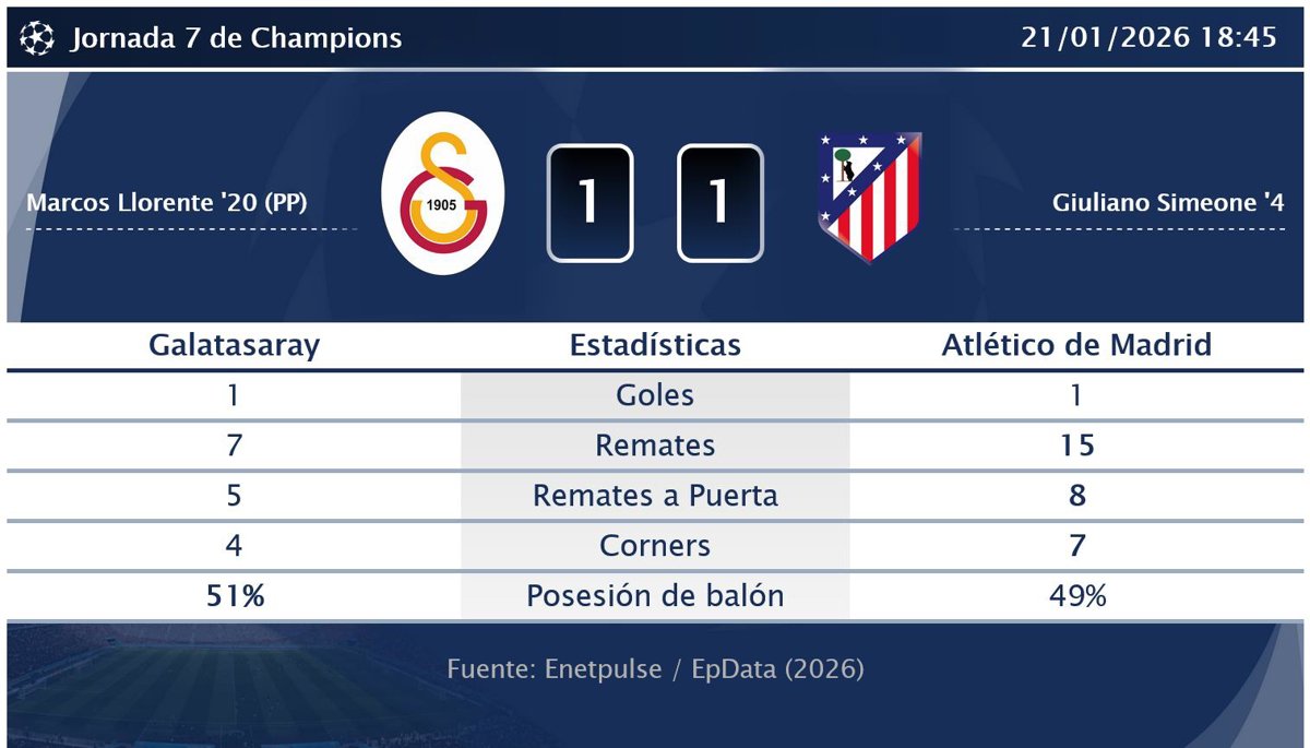 Galatasaray 1 - 1 Atlético de Madrid: resumen y estadísticas del partido de la jornada 7 de Champions - EUROPA PRESS (2026)