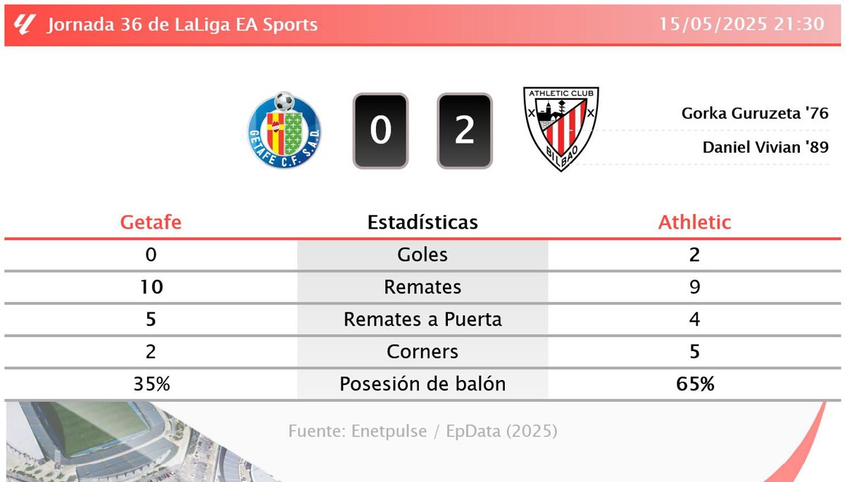 Getafe 0 - 2 Athletic: resumen y estadísticas del partido de la jornada 36 de LaLiga EA Sports - EUROPA PRESS (2025)