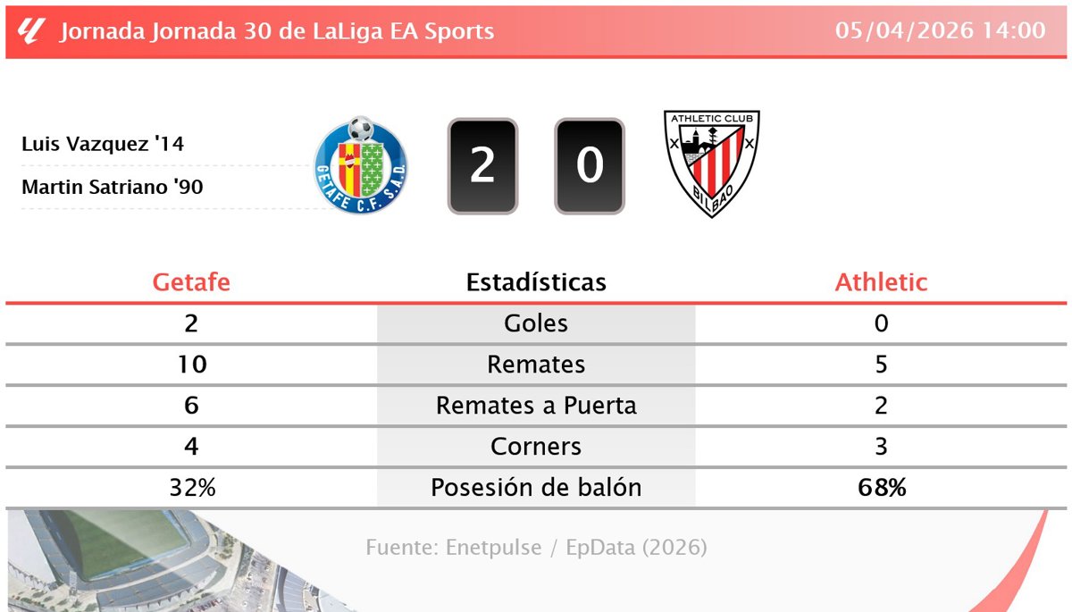 El Getafe ha ganado este domingo por 2-0 al Athletic en el Coliseum, en un encuentro correspondiente a la jornada 30 de LaLiga EA Sports donde la efectividad azulona se impuso al dominio territorial de su oponente. A pesar de que el conjunto vizcaíno llevó la iniciativa del juego con un 68% de posesión de balón y completó más del doble de pases que su rival (528 frente a 233), el equipo del sur de Madrid fue más punzante en sus acciones ofensivas, registrando un total de 10 remates frente a los 5 de los leones. Martin Satriano se erigió como el jugador más activo y determinante en el ataque de los madrileños, participando directamente en la gestación y ejecución de las acciones que decantaron la balanza. En el Coliseum, la resistencia de los visitantes se quebró temprano cuando, en el minuto 14, Luis Vázquez aprovechó una asistencia de Satriano para batir a Unai Simón y establecer el 1-0. Durante el resto del choque, los pupilos de Ernesto Valverde buscaron el empate con insistencia pero sin puntería, mientras que el bloque de Pepe Bordalás mantuvo el orden defensivo a la espera de una oportunidad para sentenciar. Ya en el tiempo de descuento, en el minuto 90, fue el propio Martin Satriano quien cerró el marcador tras recibir un pase de Mario Martín, certificando una victoria que sitúa a los azulones con 41 puntos en la octava posición de la tabla, igualados con la Real Sociedad pero con los mismos partidos disputados. Por su parte, la escuadra bilbaína se mantiene con 38 puntos en la décima plaza, a una distancia matemática de 21 puntos del descenso con 24 por disputarse, y todavía con opciones de pelear por los puestos que dan acceso a la Europa League.