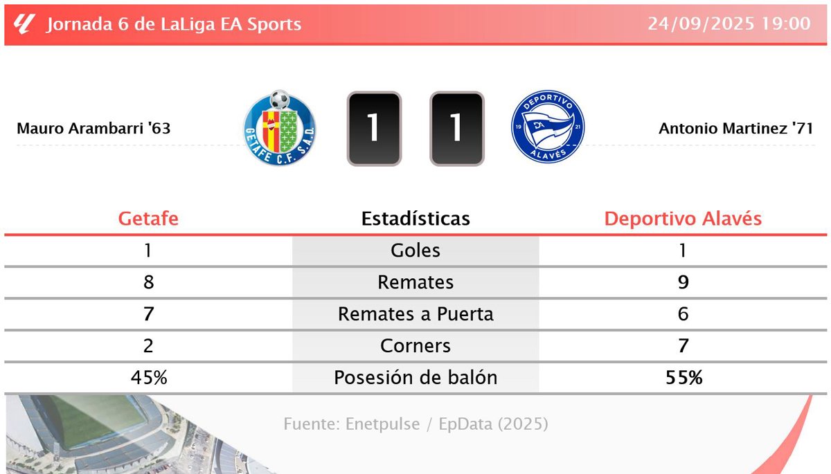El Getafe y el Deportivo Alavés firmaron tablas en un encuentro disputado en el Coliseum Alfonso Pérez, donde Mauro Arambarri adelantó a los locales en el minuto 63 con asistencia de Borja Mayoral, pero Antonio Martínez logró el empate para los visitantes en el minuto 71 con pase de Ander Guevara. Los azulones dominaron las estadísticas con mayor posesión de balón (55%) y más ataques peligrosos, mientras que Arambarri destacó como el jugador más participativo en ataque.
