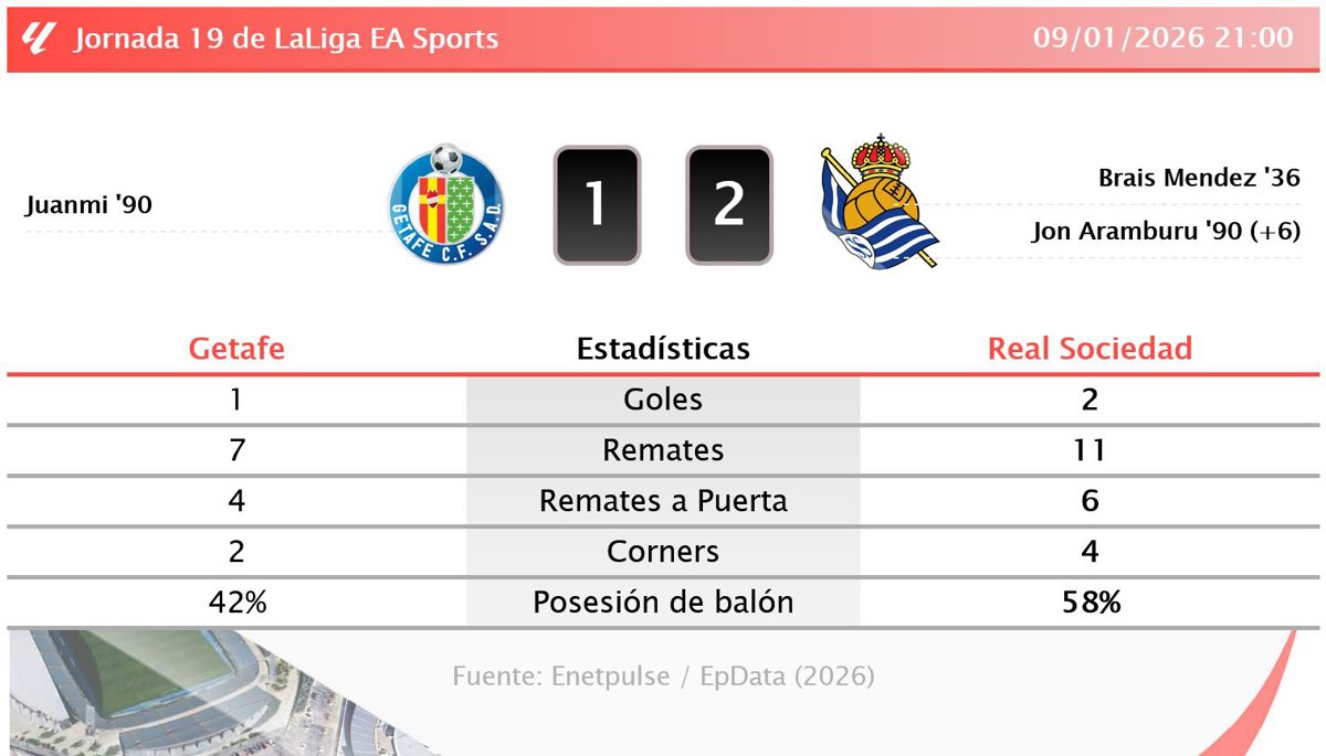 Getafe 1 - 2 Real Sociedad: resumen y estadísticas del partido de la jornada 19 de LaLiga EA Sports - EUROPA PRESS (2026)